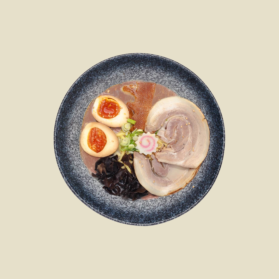 base shoyu, brodo di maiale, noodles, chashu, uovo intero, bambù, kikurage, cipollotto e naruto.